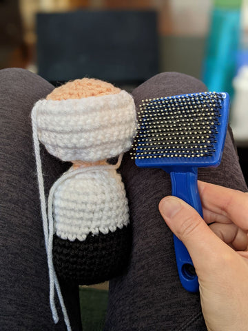Time to brush out Bernie's hair! I have never done this before, but the recommendation was to use a pet brush. I later got a good tip to use one without the little nubs on the tips so it will brush faster and more aggressively.