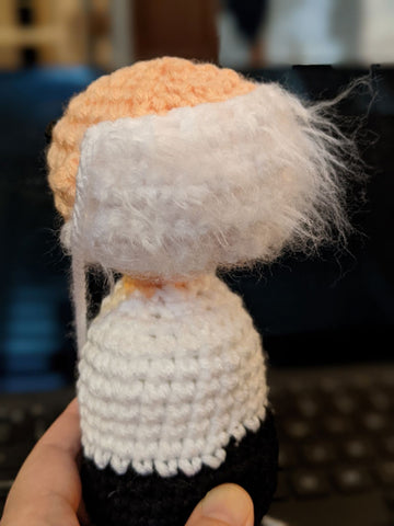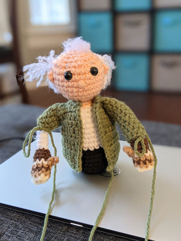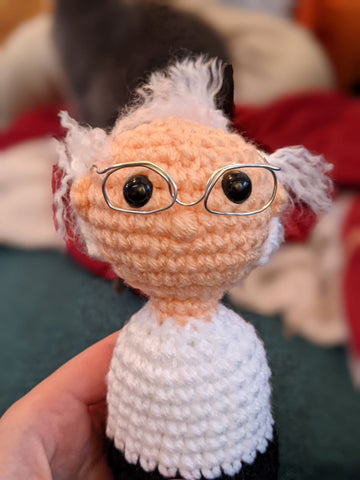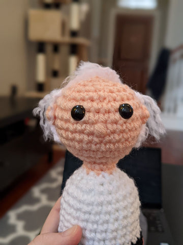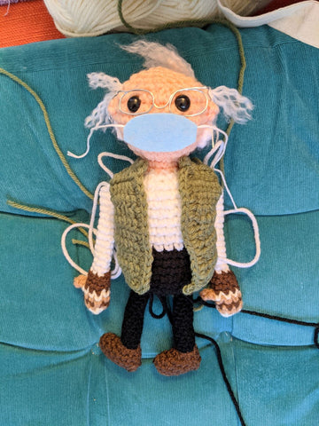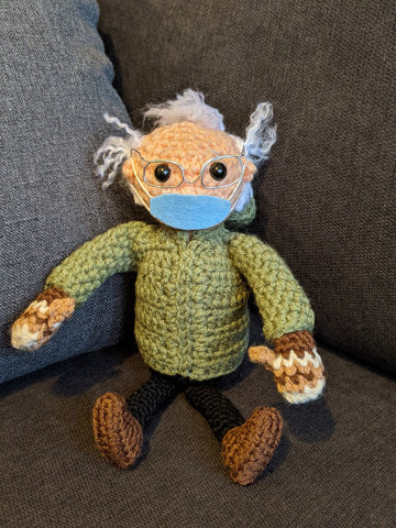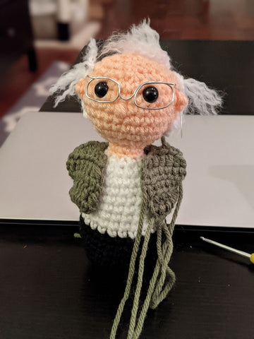 Alright now we're talking! I added some extra hairs as recommended in the pattern and Bernie is looking more like himself. It helps that his real hair is a bit wild and crazy.