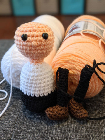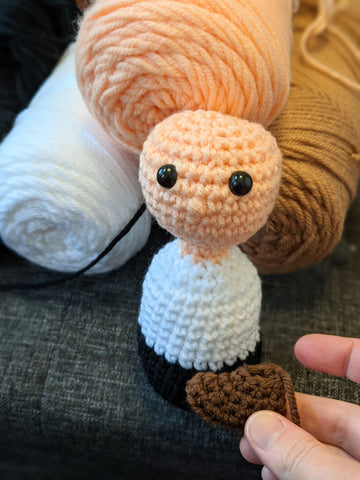 I'm about an hour in and he's looking human! I also just learned how to make the cutest little shoe ever!