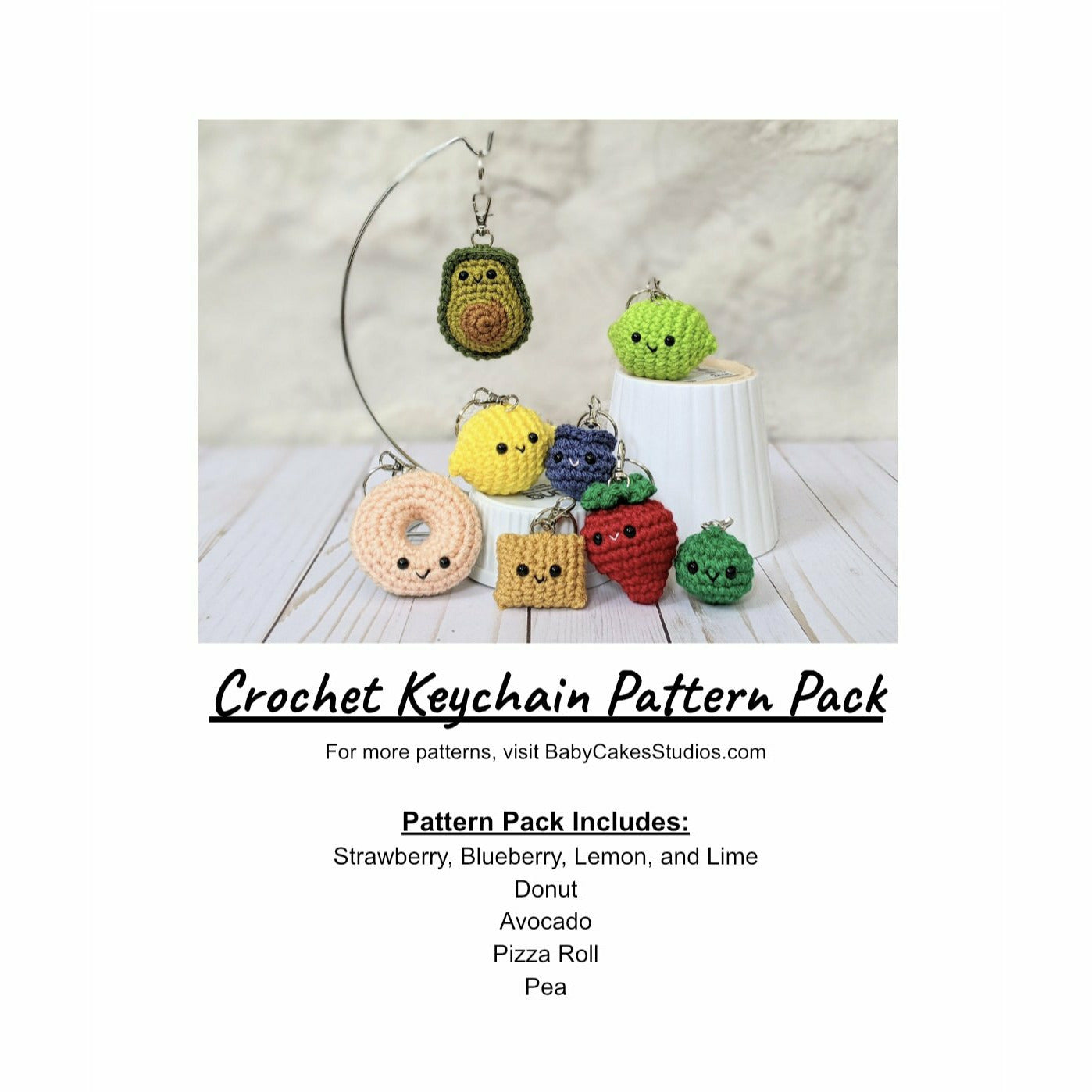 Crochet your own adorable food keychains! This pattern pack comes with downloadable instructions to make your very own avocado, donut, lemon, lime, blueberry, strawberry, pea, and pizza roll keychains. The pattern includes step by step instructions along with a list of needed items and pictures of the process and finished work.