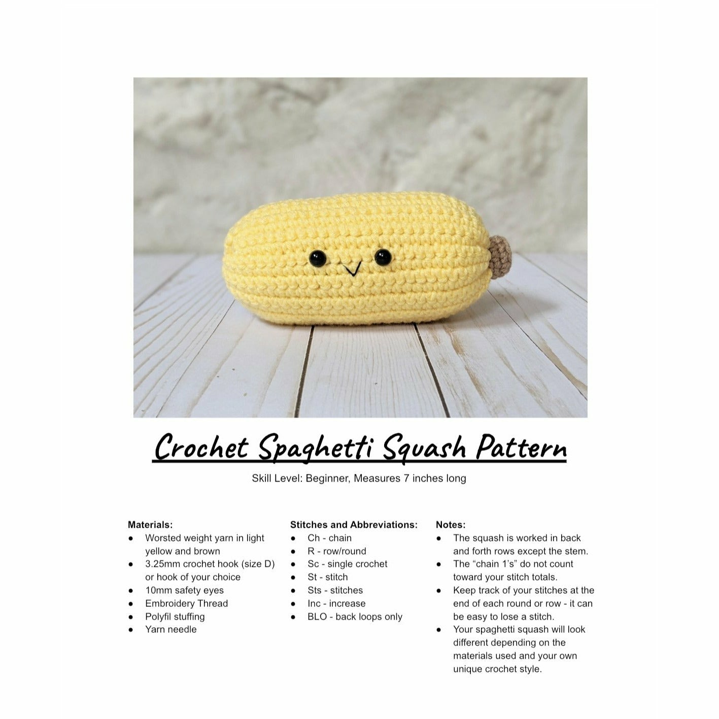 Crochet your own cute little spaghetti squash! This pattern comes as a 3 page downloadable pdf to make your very own squash. The pattern includes step by step instructions along with a list of needed items and lots of photos.