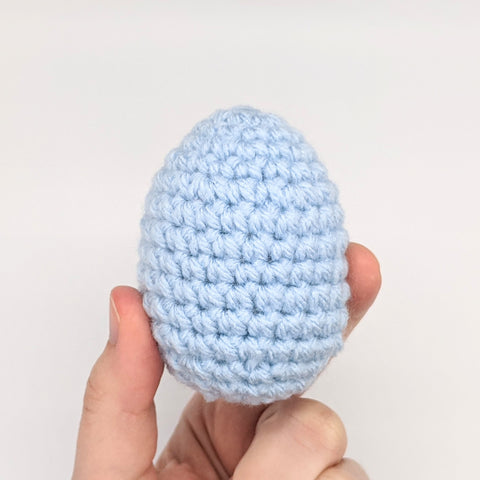 Leave a 6 inch tail and cut yarn. With yarn needle, close up hole by weaving yarn through the front loops of each sc in Round 16. Pull tight to close, and weave yarn through the egg and cut off extra.