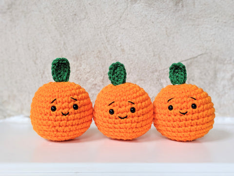 Crochet your very own orange! These orange plushes fit in the palm of your hand and are a great addition to a play kitchen or can be used as a stress ball.