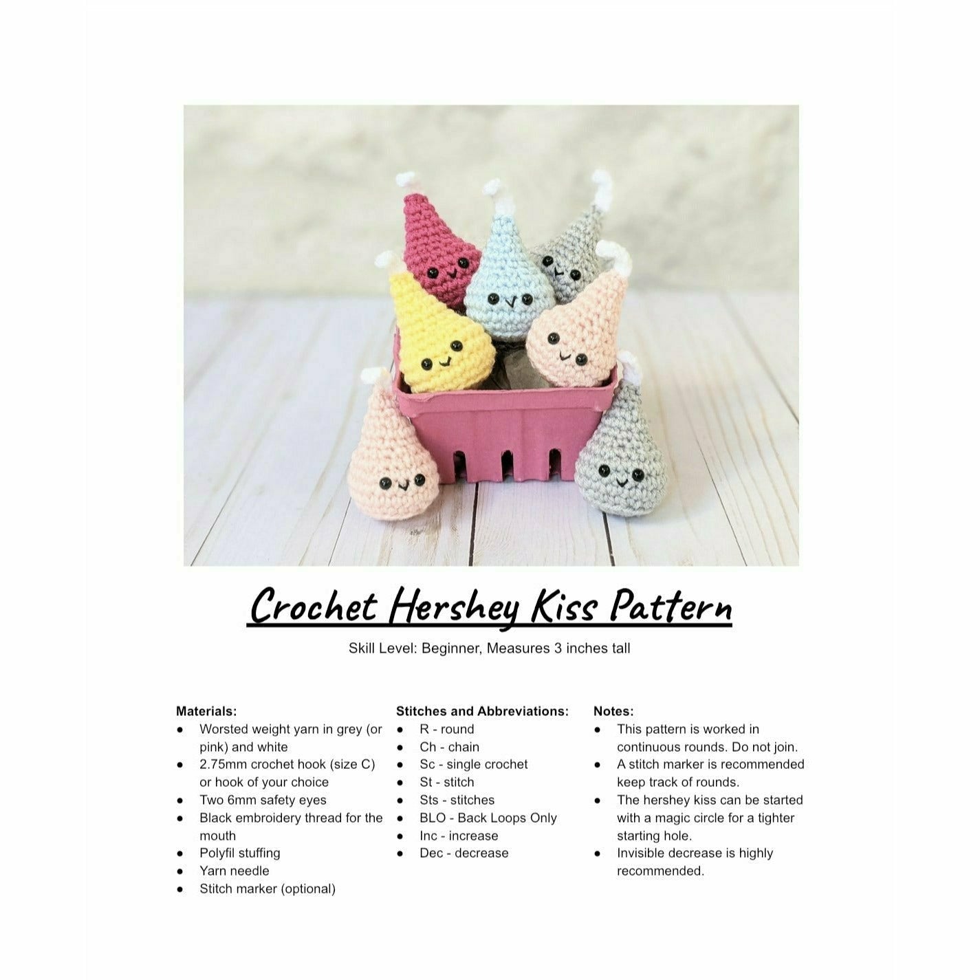 Crochet your own cute little hershey kiss! This pattern comes as a 4 page downloadable pdf to make your very own chocolate kiss. The pattern includes step by step instructions along with a list of needed items and progress photos.
