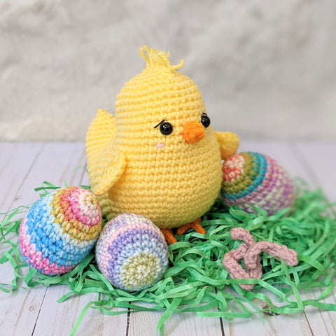 I learned some new techniques for constructing the tail and back, which is really interesting. And the pieces to sew on are really well laid out! If you're looking for a fun and (relatively) easy chick pattern I highly recommend this little guy! I gave mine some worms and Easter eggs for a little holiday feel. 🥰