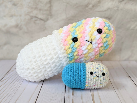 I made this little chill pill in the original size and it came out ADORABLE! It was so quick and easy that I thought it would be the perfect thing to continue my bulky yarn journey! My jumbo one was a bit harder for me to make, and I'm still learning good technique for chunky yarn. The eyes look ok, but the I'm still figuring out smiles. I think it still turned out so cute though! Maybe it's good for people who REALLY need to chill haha. I do think the original is my favorite though.