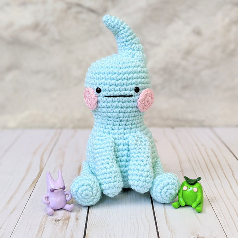 Maker Monday - Special 5th Monday edition! Since this month has 5 Mondays, I wanted to do something a little different for this last one. Instead of follow another crocheters pattern and learn from it, I decided to make some fan art based on my favorite polymer clay artist @stayokaystudio ! I am in love with Annabeth's Good Folk crew, and was so excited to crochet her little Weep character. It's good practice to always ask before you make another designers work in your own medium, just to be sure they are ok with it! Here is my Weep posing with her creations Wink and Froggie.