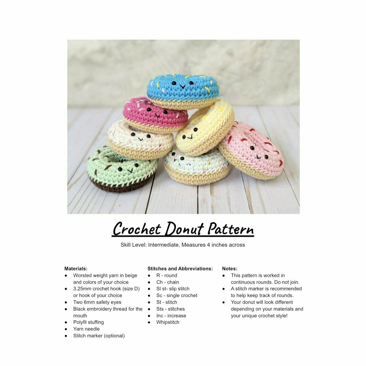 Crochet your own cute little donuts! This pattern comes as a 5 page downloadable pdf to make your very own donuts. The pattern includes step by step instructions along with a list of needed items and lots of photos.