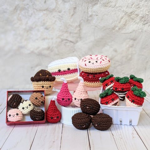 Crochet your own cute Valentine's Day plushes! This pattern pack comes with 7 downloadable patterns to make your very own chocolate covered strawberries, truffles, kisses, cake, cupcakes, donuts, and brownies. The pattern includes step by step instructions along with a list of needed items and pictures of the process and finished work. Find the pattern pack HERE! <-----------