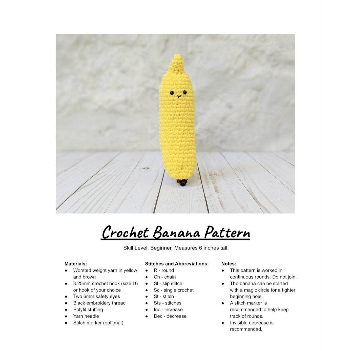 Crochet your own cute little banana! This pattern comes as a 3 page downloadable pdf to make your very own banana. The pattern includes step by step instructions along with a list of needed items and pictures of the finished work.